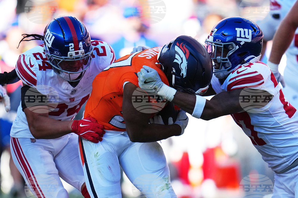 Denver Broncos running back RJ Harvey (12) is tacklwed by New York Giants cornerback Dru Phillips, left, inside linebacker Bobby Okereke (58) and linebacker Abdul Carter (51) during the first half of an NFL football game in Denver, Sunday, Oct. 19, 2025. (AP Photo/David Zalubowski)