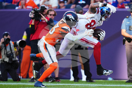 Denver Broncos wide receiver Troy Franklin, left, catches a pass against New York Giants cornerback Cordale Flott (28) during the second half of an NFL football game in Denver, Sunday, Oct. 19, 2025. (AP Photo/David Zalubowski)