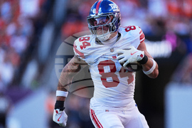 New York Giants tight end Theo Johnson (84) runs toward the end zone to score against the Denver Broncos during the second half of an NFL football game in Denver, Sunday, Oct. 19, 2025. (AP Photo/David Zalubowski)