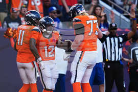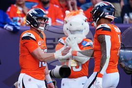 Denver Broncos quarterback Bo Nix, left, is congratulated by tight end Evan Engram after scoring against the New York Giants during the second half of an NFL football game in Denver, Sunday, Oct. 19, 2025. (AP Photo/Jack Dempsey)
