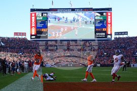 An image of former Denver Broncos wide receiver Demaryius Thomas, middle, is shown as Broncos owner Carrie Walton Penner, left, owner and chief executive officer Greg Penner, second from right, and owner Rob Walton applaud during a ceremony unveiling the Broncos Ring of Fame plaque for Thomas at halftime of an NFL football game between the Broncos and the New York Giants in Denver, Sunday, Oct. 19, 2025. (AP Photo/Jack Dempsey)