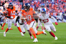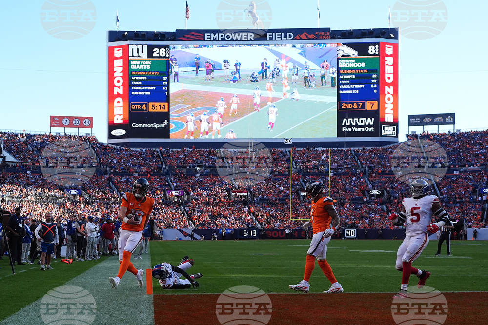 Denver Broncos quarterback Bo Nix, bottom left, scores against the New York Giants during the second half of an NFL football game in Denver, Sunday, Oct. 19, 2025. (AP Photo/David Zalubowski)
