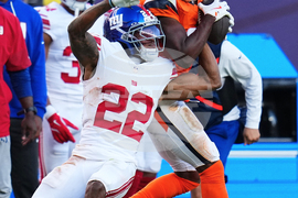 Denver Broncos wide receiver Courtland Sutton, bottom, is tackled by New York Giants cornerback Paulson Adebo (21) and safety Tyler Nubin (27) during the first half of an NFL football game in Denver, Sunday, Oct. 19, 2025. (AP Photo/Jack Dempsey)