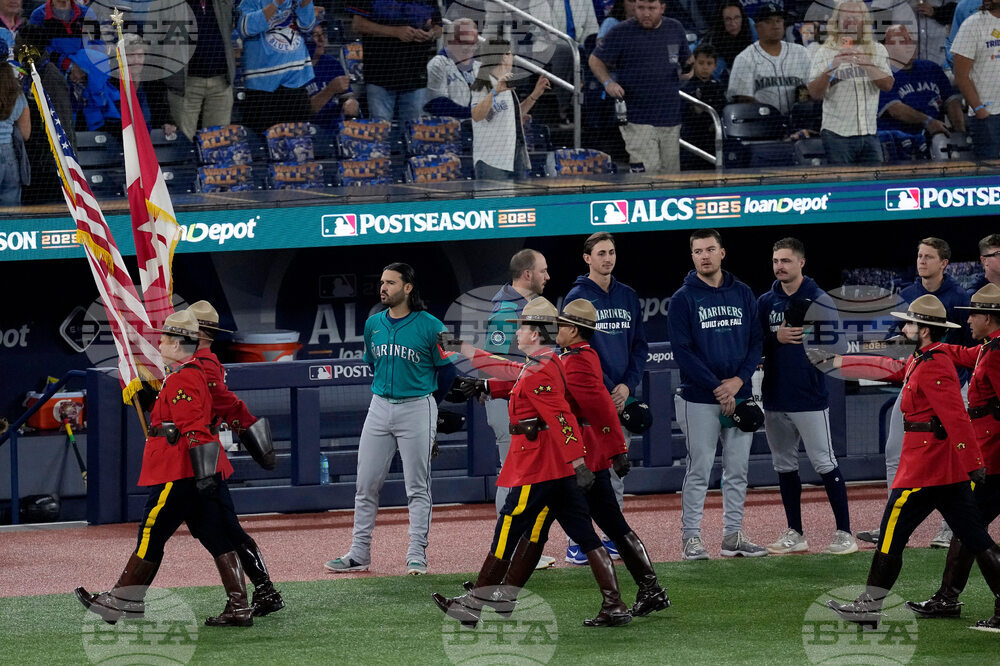 Members of the Royal Canadian Mounted Police walks past the Seattle Mariners dugout prior to Game 6 of baseball's American League Championship Series against the Toronto Blue Jays, Sunday, Oct. 19, 2025, in Toronto. (AP Photo/David J. Phillip)