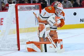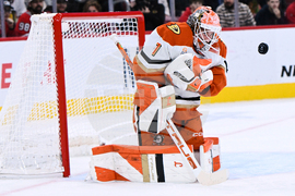 Anaheim Ducks goalie Lukas Dostal makes a save during the first period of an NHL hockey game against the Chicago Blackhawks, Sunday, Oct. 19, 2025, in Chicago. (AP Photo/Paul Beaty)