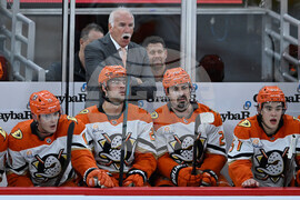 Anaheim Ducks head coach Joel Quenneville, center top, yells to his players during the second period of an NHL hockey game against the Chicago Blackhawks, Sunday, Oct. 19, 2025, in Chicago. (AP Photo/Paul Beaty)