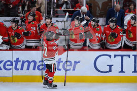 Chicago Blackhawks' Frank Nazar (91) celebrates with teammates at the bench after scoring during the third period of an NHL hockey game against the Anaheim Ducks, Sunday, Oct. 19, 2025, in Chicago. (AP Photo/Paul Beaty)