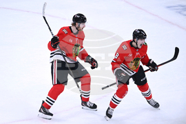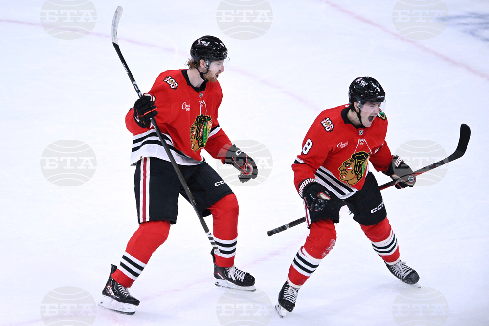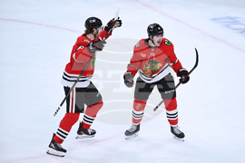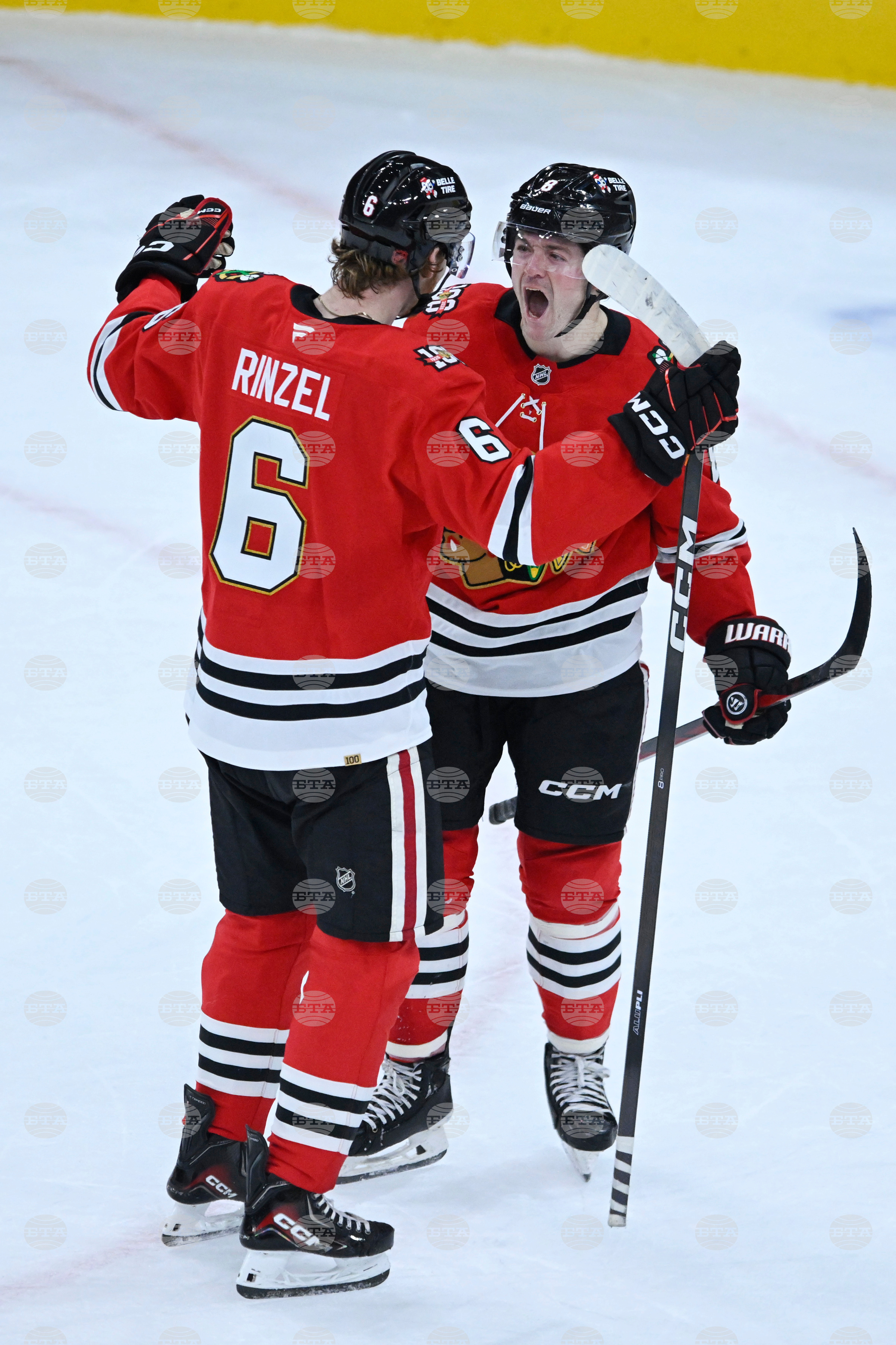 Chicago Blackhawks' Ryan Donato, right, celebrates with teammate Sam Rinzel, left, after scoring the winning goal in overtime of an NHL hockey game against the Anaheim Ducks, Sunday, Oct. 19, 2025, in Chicago. (AP Photo/Paul Beaty)