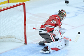 Chicago Blackhawks goalie Spencer Knight makes a save during overtime of an NHL hockey game against the Anaheim Ducks, Sunday, Oct. 19, 2025, in Chicago. (AP Photo/Paul Beaty)