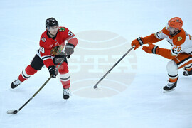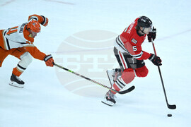 Chicago Blackhawks' Connor Murphy (5) moves the puck against Anaheim Ducks' Mikael Granlund during the second period of an NHL hockey game, Sunday, Oct. 19, 2025, in Chicago. (AP Photo/Paul Beaty)