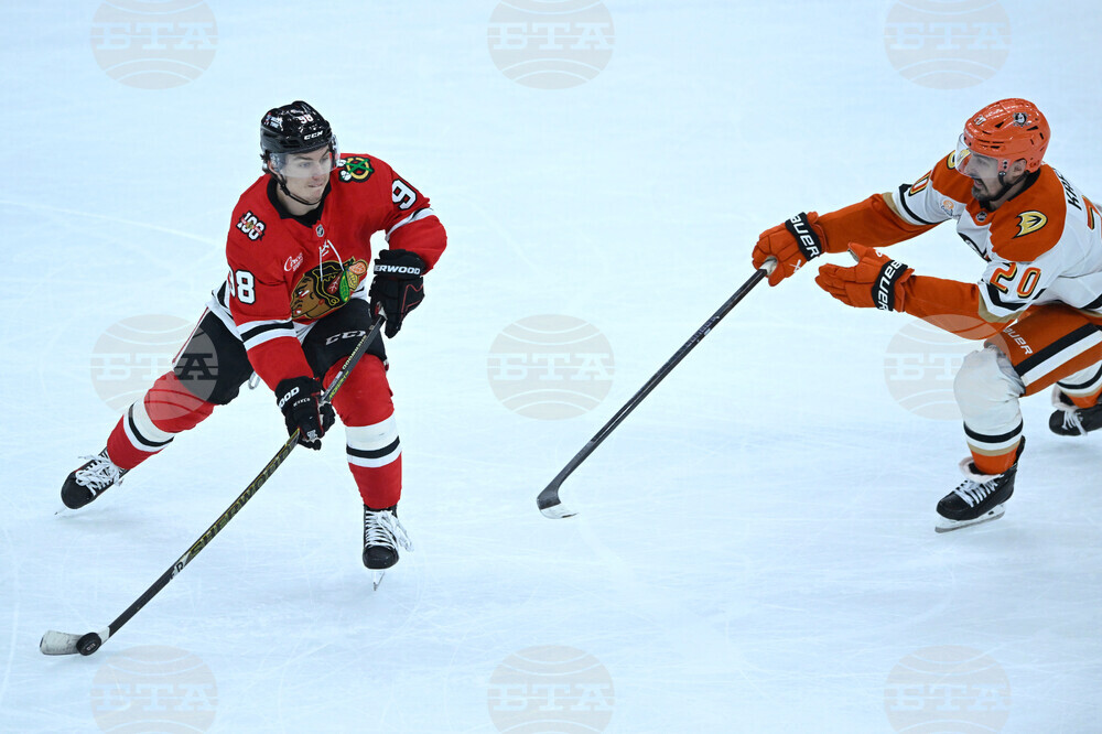 Chicago Blackhawks' Connor Bedard (98) passes against Anaheim Ducks' Chris Kreider (20) during the second period of an NHL hockey game Sunday, Oct. 19, 2025, in Chicago. (AP Photo/Paul Beaty)
