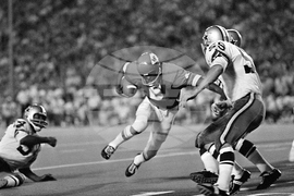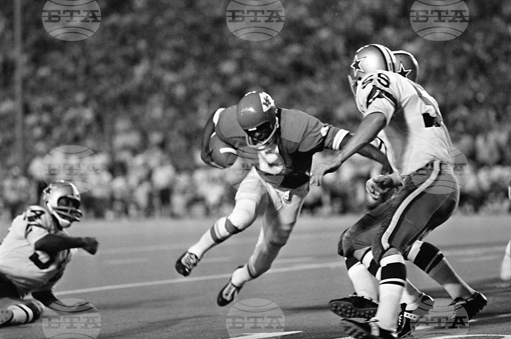 FILE - Warren McVea (6) Kansas City Chiefs running back is stopped on an end run by Dallas Cowboy Leroy Jordan (55) in the first quarter action in Dallas, Sept. 5, 1970. (AP Photo/Fred Kaufman,File)