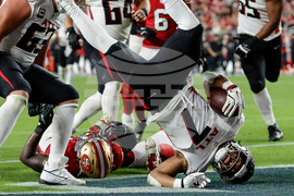 San Francisco 49ers running back Christian McCaffrey (23) scores a touchdown against the Atlanta Falcons in the first half of an NFL football game, Sunday, Oct. 19, 2025, in Santa Clara, Calif. (AP Photo/Godofredo A. Vásquez)