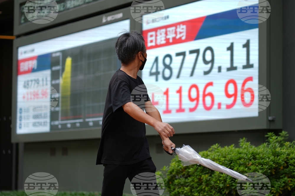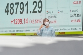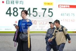 People walk in front of an electronic stock board showing Japan's Nikkei index at a securities firm Monday, Oct. 20, 2025, in Tokyo. (AP Photo/Eugene Hoshiko)