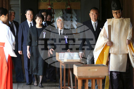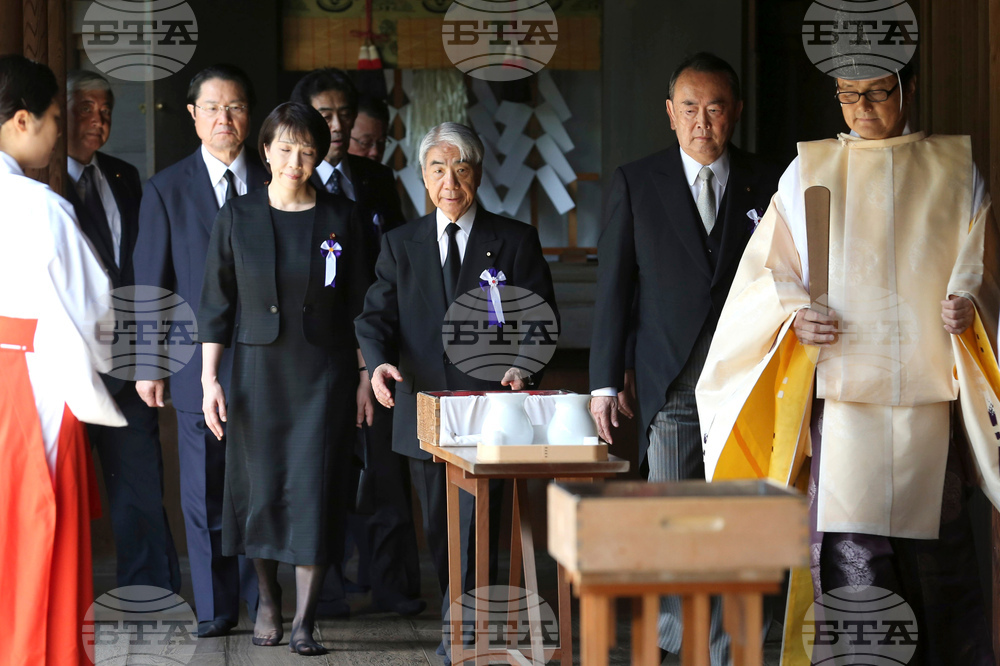FILE - Japanese lawmakers, including Sanae Takaichi, center left, visit the Yasukuni Shrine to pay respect to the war dead on the day of the 69th anniversary of the end of the World War II, in Tokyo, on Aug. 15, 2014. (AP Photo/Koji Sasahara, File)