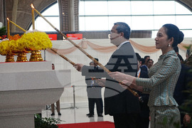 Cambodian Prime Minister Hun Manet, front left, prays together with his wife Pich Chanmony to inaugurate Techo International Airport in Kandal province, Cambodia, Monday, Oct. 20, 2025. (AP Photo/Heng Sinith)