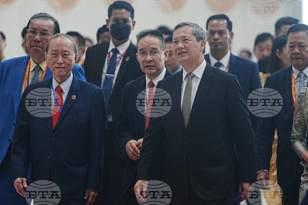 Cambodian Prime Minister Hun Manet, front right, arrives to preside over an inauguration ceremony of Techo International Airport in Kandal province, Cambodia, Monday, Oct. 20, 2025. (AP Photo/Heng Sinith)