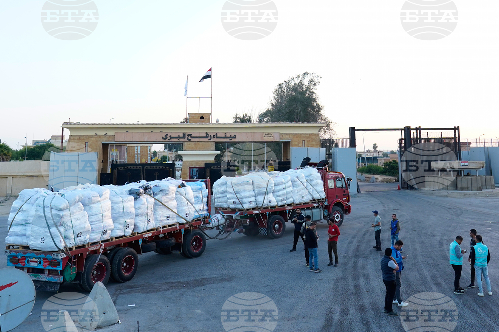 Trucks carrying humanitarian aids prepare to cross the Egyptian gate of the Rafah crossing, waiting for inspections by Israeli authorities before entering the Gaza Strip, following an agreement between Israel and Hamas on a ceasefire, Monday, Oct. 20, 2025. (AP Photo/Mohamed Arafat)
