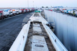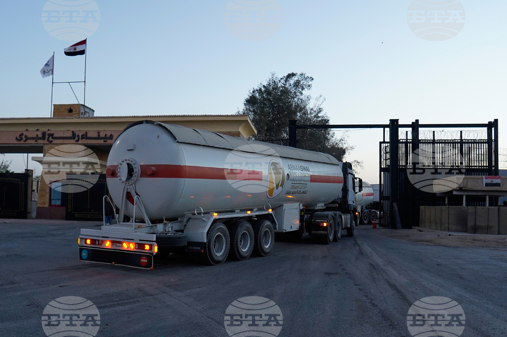 A fuel truck enters the Egyptian gate of the Rafah crossing, heading for inspection by Israeli authorities before entering the Gaza Strip, following an agreement between Israel and Hamas on a ceasefire, Monday, Oct. 20, 2025. (AP Photo/Mohamed Arafat)