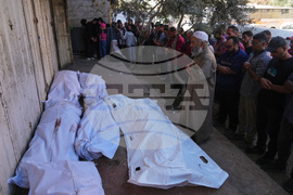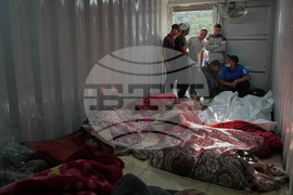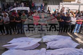 Palestinians pray over the bodies of people who were killed in an Israeli military strike on Sunday, during their funeral at Awda Hospital, in Nuseirat, in the central Gaza Strip, Monday, Oct. 20, 2025. (AP Photo/Abdel Kareem Hana)