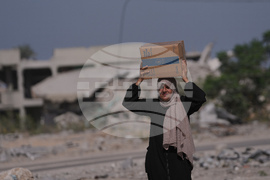 A Palestinian woman carries a box of food from the World Food Programme (WFP) after collecting it in Khan Younis, in the southern Gaza Strip, Monday, Oct. 20, 2025. (AP Photo/Jehad Alshrafi)
