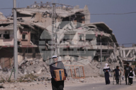 A Palestinian boy carries a box of food from the World Food Programme (WFP) after collecting it in Khan Younis, in the southern Gaza Strip, Monday, Oct. 20, 2025. (AP Photo/Jehad Alshrafi)