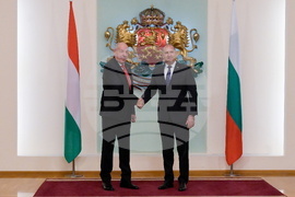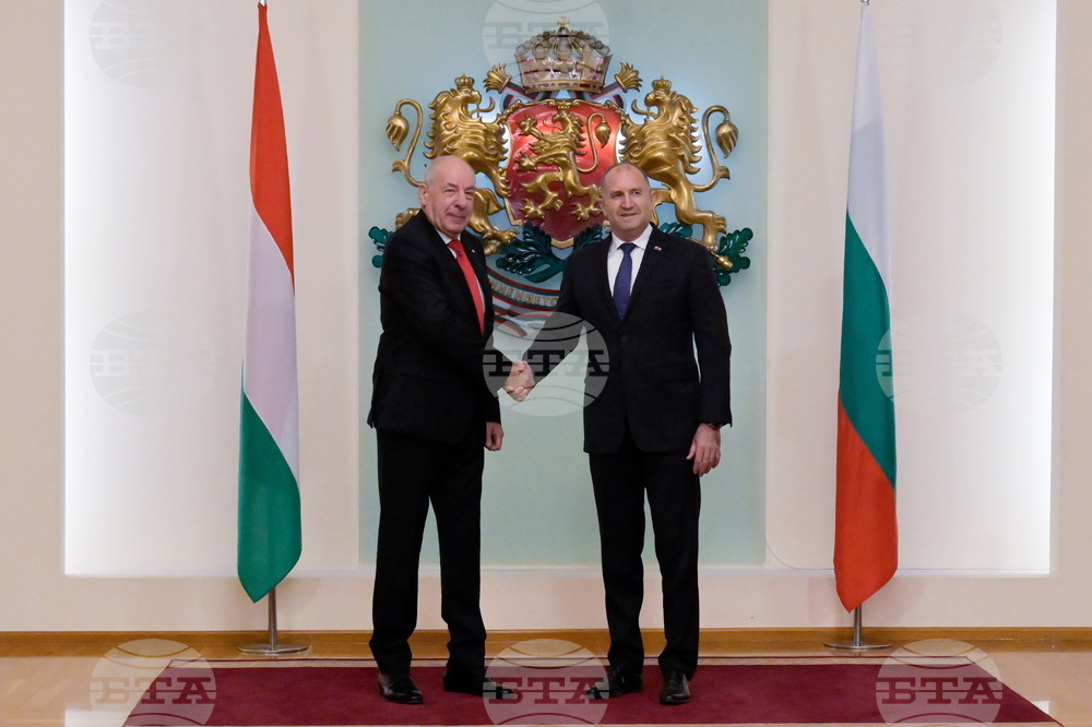 Bulgarian President Rumen Radev, right, receives Hungarian President Tamas Sulyok in Sofia, Bulgaria, Monday, October 20, 2025. (Noemi Bruzak/MTI via AP)