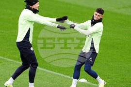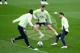 Manchester City's Nico Gonzalez (centre) and Bernardo Silva (right) during a training session at the City Football Academy, Manchester, England, Monday Oct. 20, 2025. (Martin Rickett/PA via AP)
