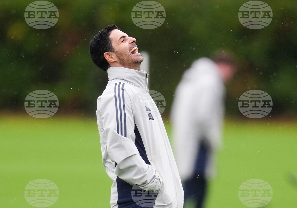 Arsenal manager Mikel Arteta during a training session at the Sobha Realty Training Centre, London Colney, England, Monday Oct. 20, 2025. (John Walton/PA via AP)