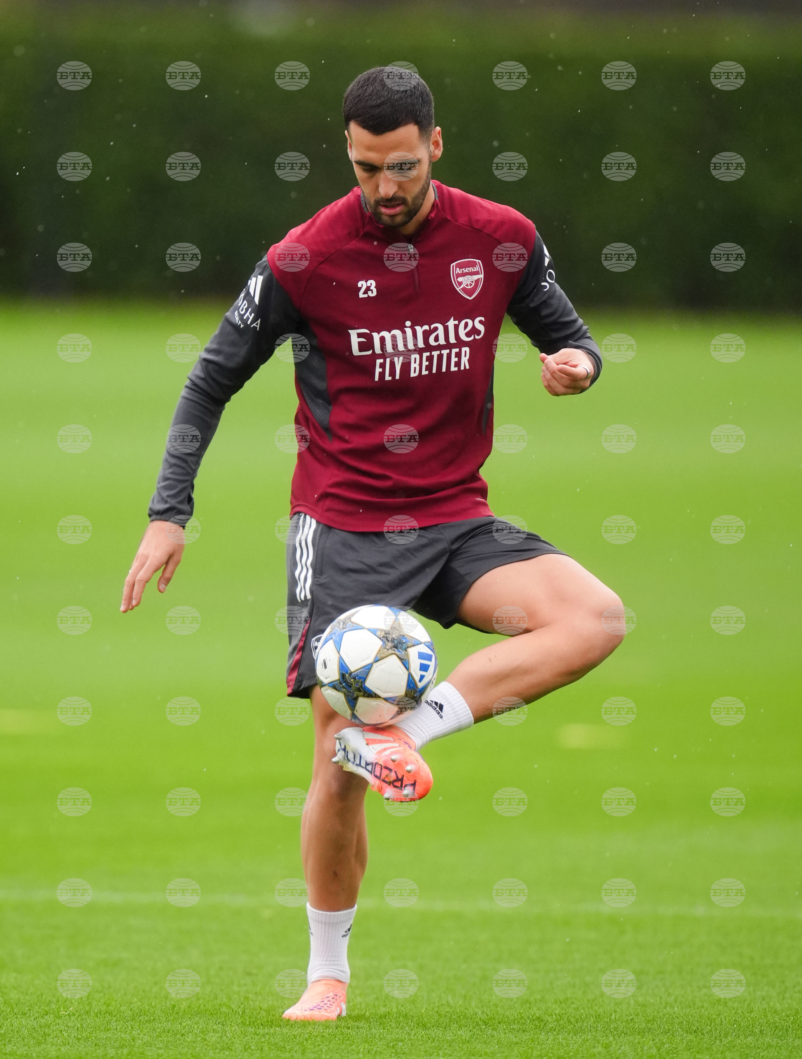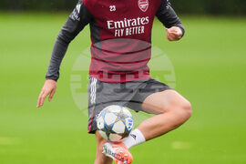 Arsenal's Mikel Merino during a training session at the Sobha Realty Training Centre, London Colney, England, Monday Oct. 20, 2025. (John Walton/PA via AP)