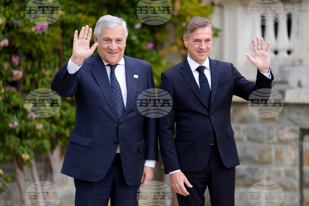 Slovenian Prime Minister Robert Golob welcomes Italy's Foreign Minister Antonio Tajani, left, as he arrives for the summit of the informal MED9 group of the nine like-minded Mediterranean EU Member States, in Portoroz, Slovenia, Monday, Oct. 20, 2025. (AP Photo/Darko Bandic)