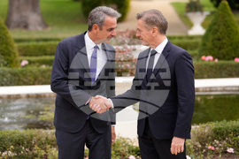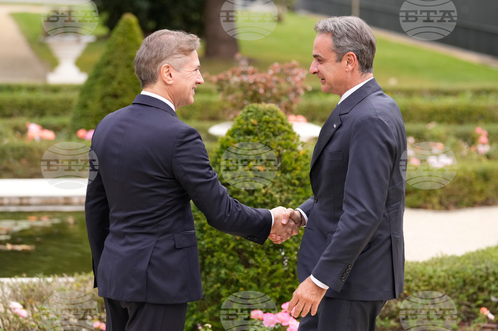 Slovenian Prime Minister Robert Golob welcomes Prime Minister of Greece Kyriakos Mitsotakis, left, as he arrives for the summit of the informal MED9 group of the nine like-minded Mediterranean EU Member States, in Portoroz, Slovenia, Monday, Oct. 20, 2025. (AP Photo/Darko Bandic)