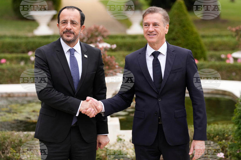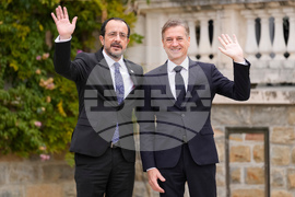 Slovenian Prime Minister Robert Golob welcomes President of Cyprus Nikos Christodoulides, left, as he arrives for the summit of the informal MED9 group of the nine like-minded Mediterranean EU Member States, in Portoroz, Slovenia, Monday, Oct. 20, 2025. (AP Photo/Darko Bandic)