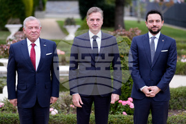 Slovenian Prime Minister Robert Golob, cent6er, poses with King Abdullah II of Jordan, left, and his son Prince Hussein as they arrive at the summit of the informal MED9 group of the nine like-minded Mediterranean EU Member States, in Portoroz, Slovenia, Monday, Oct. 20, 2025. (AP Photo/Darko Bandic)