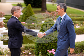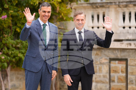 Slovenian Prime Minister Robert Golob welcomes Prime Minister of Spain Pedro Sanchez, left, as he arrives for the summit of the informal MED9 group of the nine like-minded Mediterranean EU Member States, in Portoroz, Slovenia, Monday, Oct. 20, 2025. (AP Photo/Darko Bandic)