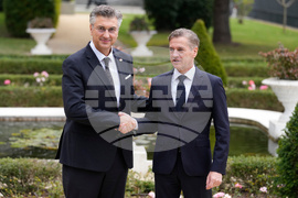 Slovenian Prime Minister Robert Golob welcomes Prime Minister of Croatia Andrej Plenkovic, left, as he arrives for the summit of the informal MED9 group of the nine like-minded Mediterranean EU Member States, in Portoroz, Slovenia, Monday, Oct. 20, 2025. (AP Photo/Darko Bandic)