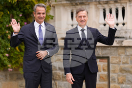 Slovenian Prime Minister Robert Golob welcomes Prime Minister of Greece Kyriakos Mitsotakis, right, as he arrives for the summit of the informal MED9 group of the nine like-minded Mediterranean EU Member States, in Portoroz, Slovenia, Monday, Oct. 20, 2025. (AP Photo/Darko Bandic)