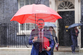 Wes Streeting, Britain's Secretary of State for Health and Social Care holds a Labour umbrella as he arrives to attend a Cabinet meeting in Downing Street in London, Monday, Oct. 20, 2025. (AP Photo/Kirsty Wigglesworth)