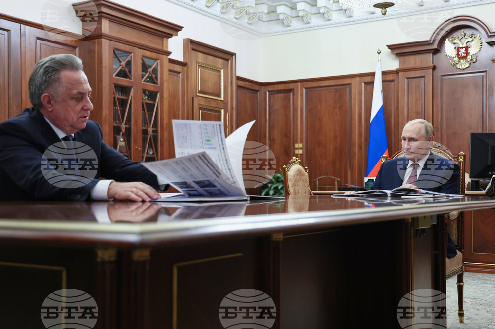 Russian President Vladimir Putin listens to Vitaly Mutko, the chief executive officer of Dom.RF, not pictured, during their meeting at the Kremlin in Moscow, Russia, on Monday, Oct. 20, 2025. (Alexander Kazakov, Sputnik, Kremlin Pool Photo via AP)