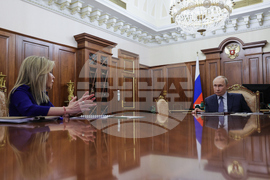 Russian President Vladimir Putin, right, listens to the head of the Federal Service for Supervision of Natural Resources (Rosprirodnadzor) Svetlana Radionova during their meeting at the Kremlin in Moscow, Russia, on Tuesday, Oct. 21, 2025. (Alexander Kazakov, Sputnik, Kremlin Pool Photo via AP)