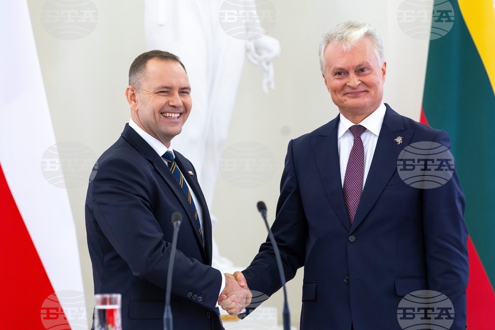 FILE - Polish President Karol Nawrocki, left, shakes hands with Lithuania's President Gitanas Nauseda after a joint press conference at the President's palace in Vilnius, Lithuania, Monday, Sept. 8, 2025. (AP Photo/Mindaugas Kulbis, file)