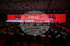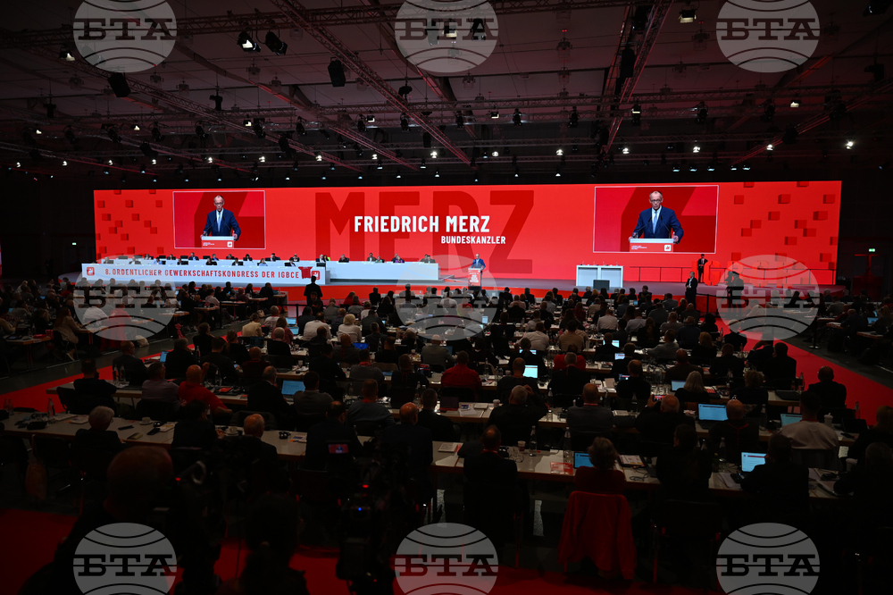 German Chancellor Friedrich Merz speaks at the congress of the German Mining, Chemical and Energy Industrial Union (IGBCE), in Hanover, Germany, Monday, Oct. 20, 2025. (Shireen Broszies/dpa via AP)