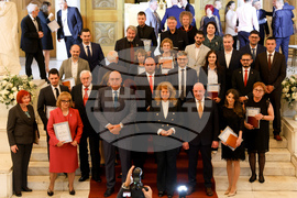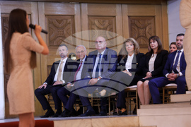 София (20 октомври 2025) Церемония по връчване на наградите на Българския лекарски съюз (БЛС) за принос в медицината „Лекар на годината – 2025“ се провежда в Националния исторически музей. На снимката (от ляво надясно): управителят на Националната здравно-осигурителна каса (НЗОК) доц. д-р Петко Стефановски, министърът на здравеопазването Силви Кирилов, председателят на Българския лекарски съюз (БЛС) д-р Николай Брънзалов, вицепрезидентът на Република България Илияна Йотова, омбудсманът на Република България Велислава Делчева и подуправителят на Националната здравно-осигурителна каса (НЗОК) проф. Момчил Мавров.