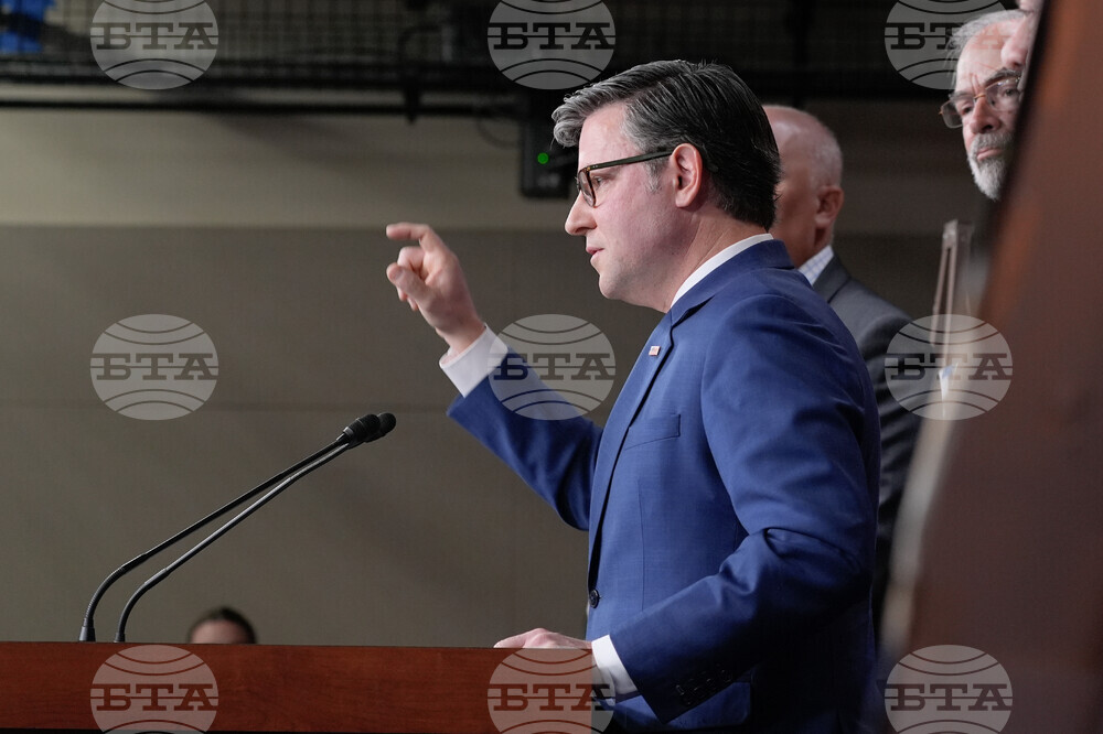 Speaker of the House Mike Johnson, R-La., center, speaks during a news conference on Capitol Hill, Monday, Oct. 20, 2025, in Washington. (AP Photo/Mariam Zuhaib)