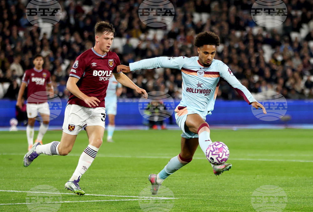 West Ham United's Oliver Scarles, left, and Brentford's Kevin Schade battle for the ball during the English Premier League soccer match between West Ham United and Brentford at the London Stadium, London, Monday Oct. 20, 2025. (Steven Paston/PA via AP)