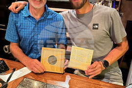 Michelino Sunseri, right, accepts a ceremonial belt buckle from Andy Anderson on Sept. 6, 2024, in Truckee, Calif., after breaking Anderson's record time for running up and down Grand Teton mountain in Grand Teton National Park in Wyoming a few days earlier. (Michelino Sunseri via AP)