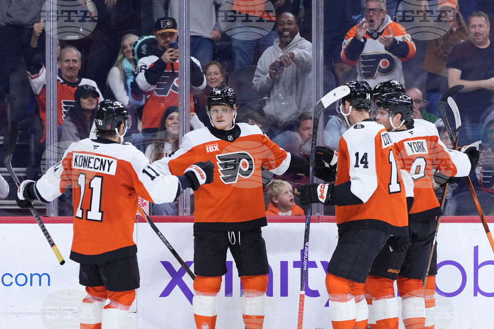 Philadelphia Flyers' Travis Konecny, center, celebrates with Matvei Michkov, left, and Noah Juulsen after scoring a goal during the second period of an NHL hockey game against the Seattle Kraken Monday , Oct. 20, 2025, in Philadelphia. (AP Photo/Matt Slocum)