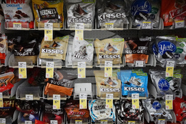 Hershey's chocolate are displayed on shelves at a grocery store in Mount Prospect, Ill., Monday, Oct. 20, 2025. (AP Photo/Nam Y. Huh)