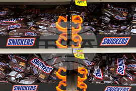 Snickers chocolate bars are displayed on shelves at a grocery store in Mount Prospect, Ill., Monday, Oct. 20, 2025. (AP Photo/Nam Y. Huh)
