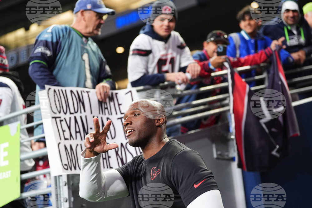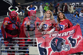Houston Texans fans pose for a photo as they watch warmups before an NFL football game against the Seattle Seahawks Monday, Oct. 20, 2025, in Seattle. (AP Photo/Lindsey Wasson)
